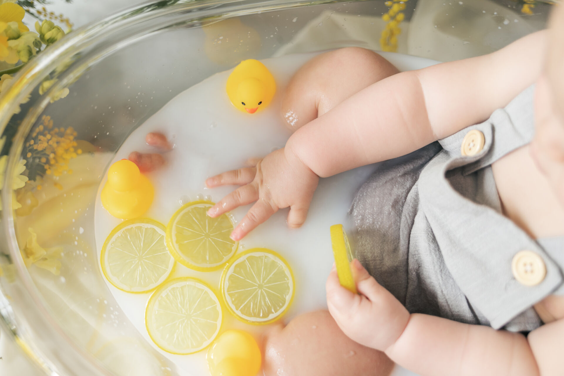 小さなバスタブに入って沐浴をしているかわいい瞬間を
